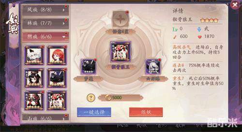骸骨狼王:妖典可合成,天师试炼也可以免费拿一只。阴系核心输出,人头收割机,伤害高,高概率连击,并且死亡后还有概率复活,复活起来继续莽。