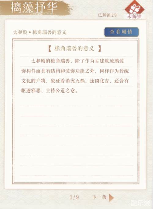 登陆游戏后,玩家将领到一个拍摄故宫文化纪录片的任务,可选择游戏男主和对应的故宫珍品进行拍摄,在这过程中可与男主一起游览故宫景点,深入领略中华历史和文化。一番探索下来,很快就能了解完《千里江山图》、金瓯永固杯、金嵌珍珠天球仪、“大圣遗音”琴这些珍藏文物背后的动人故事,触发随机“趣事”后还附赠解锁瑞兽、金砖等故宫建筑文化小知识。