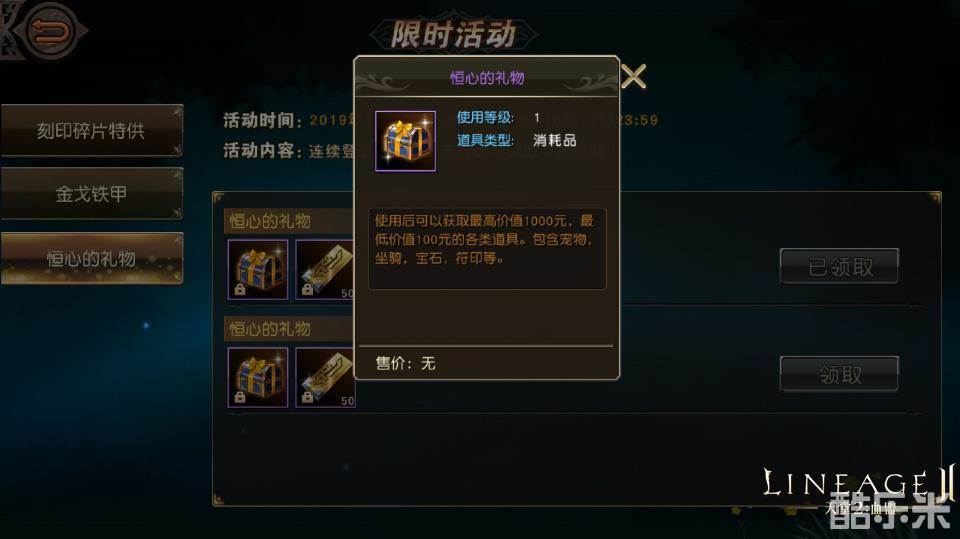 累计登陆3天和5天可领取的一种奖励,奖励包括50个启示封印重置卷轴,可以一键重置后扫荡来获取大量经验;除了重置卷轴外还能获得一个恒心的礼物宝箱,打开后可以获得各类商城道具,例如宠物、坐骑、宝石或者符印等等。恒心的礼物在每周的循环开始后更新领取次数,现阶段每周都可以参与活动噢,属于前期升级和提升实力最直接的福利活动。