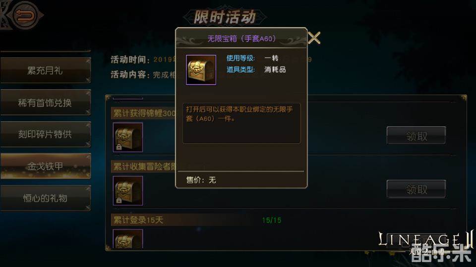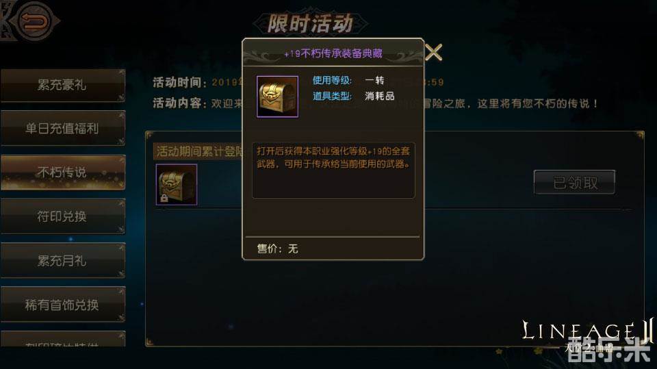 最简单容易达成的新服福利,累计登陆5天即可拿到+19不朽传承装备典藏宝箱,打开后获得本职业强化等级+19的武器(有副手武器的职业同时获得一件+19的副手),不可直接装备,可用于传承给当前使用的武器。ps.武器+19会有紫色的光芒,超炫酷哈。