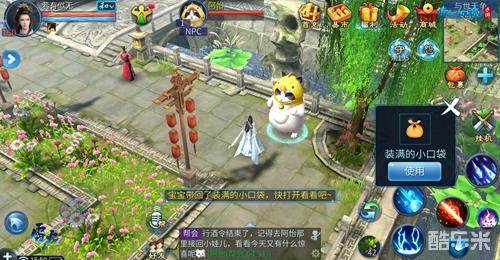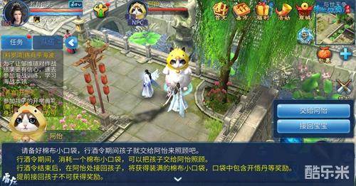 家长们只需要准备好棉布小口袋,点击帮会中出现的阿怡,进行对话,就可以把孩子交给阿怡照顾,自己则可以放心地去与帮会成员参加行酒令。