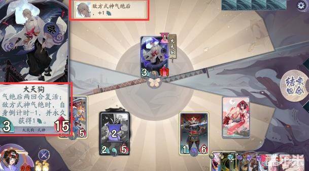 1、大天狗开局就有15点生命,敌方每有一名式神气绝时就减少-点自身“倒计时”,永久获得+1力量,而且大天狗气绝之后,只要两个回合就能复活,这会使他更快地回到战场。