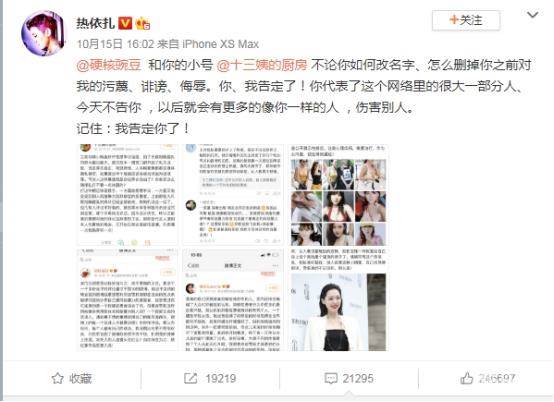 这位网友的发言引起了热依扎的的重视,热依扎表示:“记住:我告定你了”