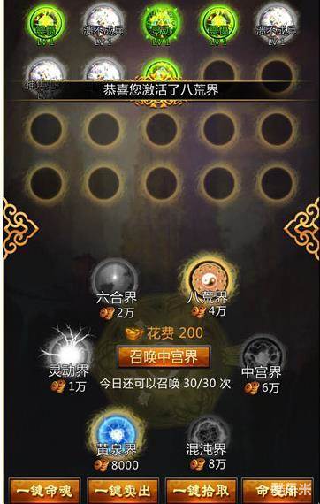命魂获取界面中。命魂来自从黄泉界到混沌界的六个不同的界。一般来说,界的层次越高,能获得高品质命魂的机会也就越多。对于紫色以上命魂,一般的都需要中宫界之上才可以获得。这里需要注意,起初只能召唤黄泉界,只有在一个界召唤过一次命魂,下一界才有可能被激活。当然激活也是有概率看运气的,要想激活到最后一界,需要召唤的次数是不可小觑的。