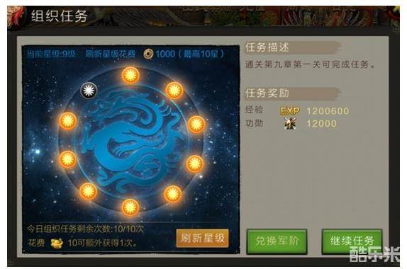 组织任务:按照任务星级,玩家等级来划分的支线任务;高经验,还能赚取功勋兑换军阶提高角色属性;