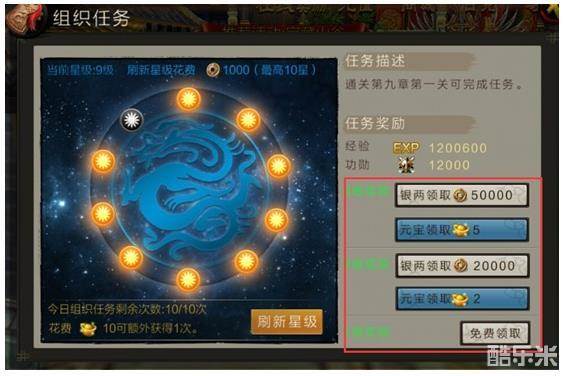 通过刷新星级接取高等级星级任务(10级为最高级),可获取更多经验;