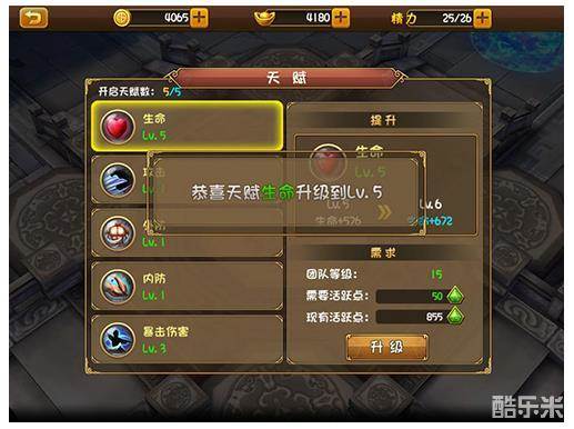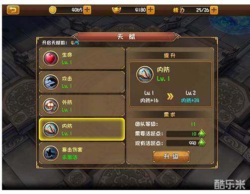 在天赋系统的界面中,可以激活的天赋种类是由玩家所带领的团队等级决定的。玩家们通过升级操作可以提升不同的天赋属性效果。小编这里要提醒各位玩家,天赋升级过程是需要消耗活跃点的。