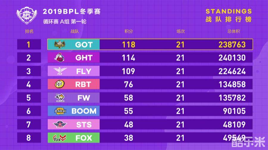 常规赛第二周为期三天的循环赛比拼,A组经历一个比赛日,GOT、GHT实力均衡,互相压制对方,榜首在他们之间来回变动,FLY穷追不舍暂居榜三,与GOT相差仅9分。在未来三天的第三周比赛中,积分排名仍有很大变数。