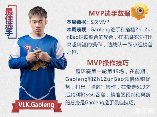 相较之下, B组在第二周经历两个比赛日,队伍间的实力拉锯异常大,VLK如同英勇神将,两天连斩八胜,稳稳牢固榜首之位。除了CD与VLK相争激烈外,其他战队实力不相上下,上周以2分垫底的TOP终脱离谷底。上周也是属于VLK的一周,手感越打越热的他们包揽了周最佳数据和最佳选手,GaoLeng和Zh1ZunBao的神兵组合又回来了。