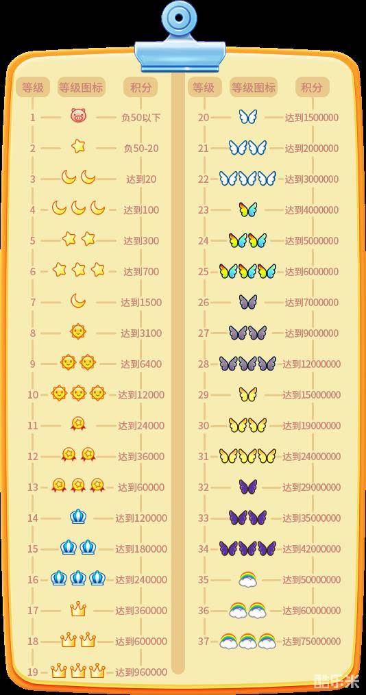 获得足够游戏积分后,即可增长游戏等级,并展示不同图标,详情如下: