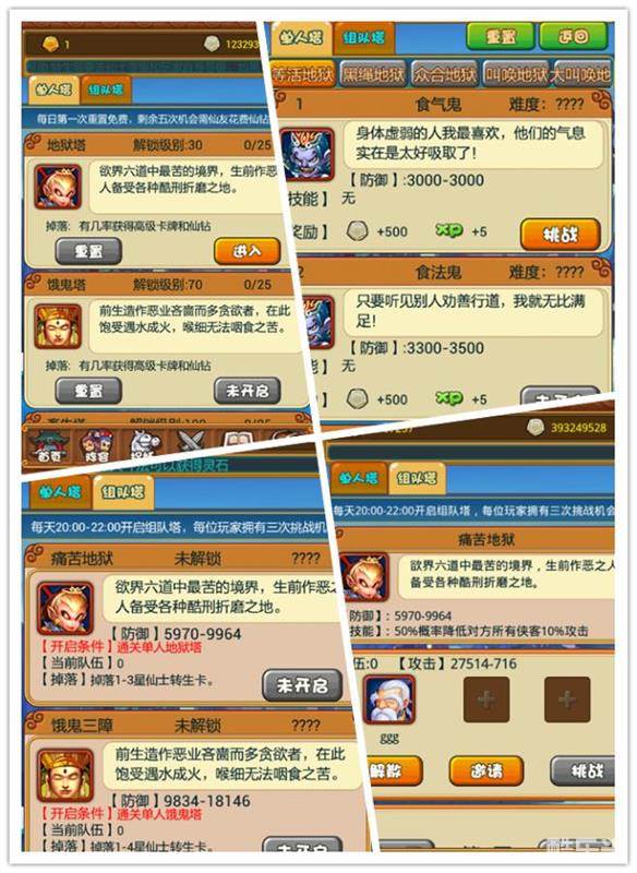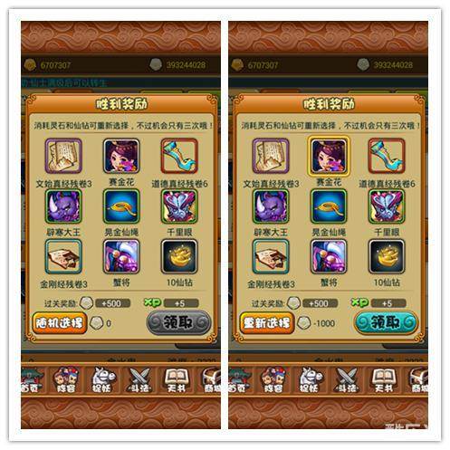 扫单人塔胜利除了正常的经验和灵石奖励外,还可以通过九宫格大转盘随机获得高级仙士卡牌、装备卡牌、仙钻、天书残卷,全凭运气喽,当然对抽取的奖励不满意的话有三次重新抽取的机会。第一次1000灵石,第二次10仙钻,第三次50仙钻。多人塔胜利可以随机抽取转生卡和大量灵石,这是游戏中获取转生卡的主要途径(当然全凭运气哦)