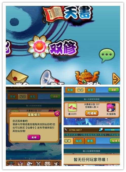 玩家如果单身还可以通过双修系统-仙侣-挖墙脚抢夺其他玩家的仙侣哦,前提是您的实力强大可以横刀夺爱!