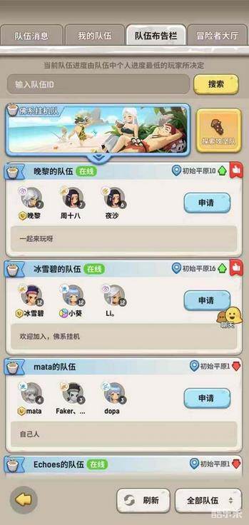 在战斗页面右边有队伍按钮,点击可以看到队伍消息,我的队伍,队伍布告栏,冒险者大厅