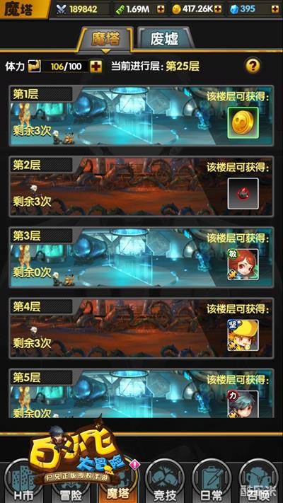 《白小飞大冒险》的魔塔探索是单人闯关的玩法,玩家升到55级就可以获得挑战魔塔的资格。挑战魔塔需要消耗体力,并且每一层魔塔每天都有3次挑战次数。魔塔层数多达百层以上,玩家要从第一层开始往上逐层挑战。魔塔每一层的地图都不同,玩家需要探索不同的区域,寻找并击败该层的BOSS,才能打开通往下一层的通道。
