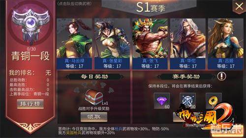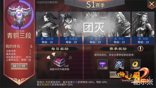 此外在竞技场环节中,玩家每天还会得到一个随机的战斗BUFF,玩家可以根据主将的优势技能再搭配战斗BUFF,相信有出其不意的效果哦。竞技场每日会根据玩家的战斗表现发放奖励,奖励丰厚程度将取决于玩家当前段位以及当日获得的星星数量。
