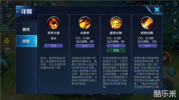 【火球术】:安琪拉的一技能,此技能的冷却时间极短,是安琪拉的主要输出技能,线上消耗敌方英雄与清理兵线能力一流,推荐主加此技能。