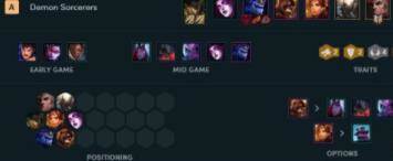 前期我们拿到游侠羁绊搭配一张坦度盖伦卡片帮助发育,虽然没有贵族羁绊的坦度加成但是游侠羁绊触发提供很出色的攻速及输出能力。中期我们拿到阵容核心的恶魔羁绊,并搭配阵容主C龙王开始发力。