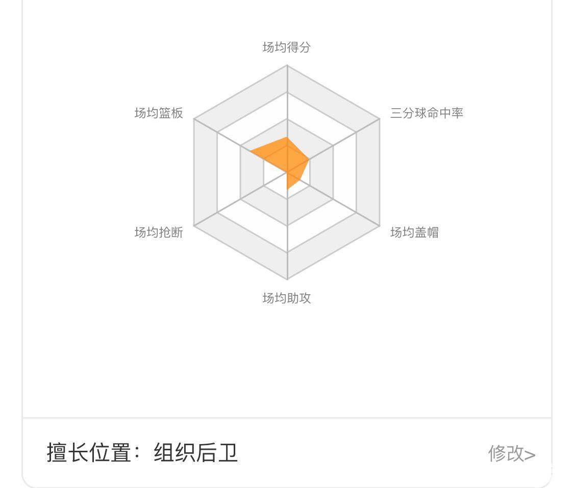 数据统计还会分析玩家的六芒星能力,包括场均得分、三分球命中率、场均盖帽、场均助攻、场均抢断以及场均篮板。
