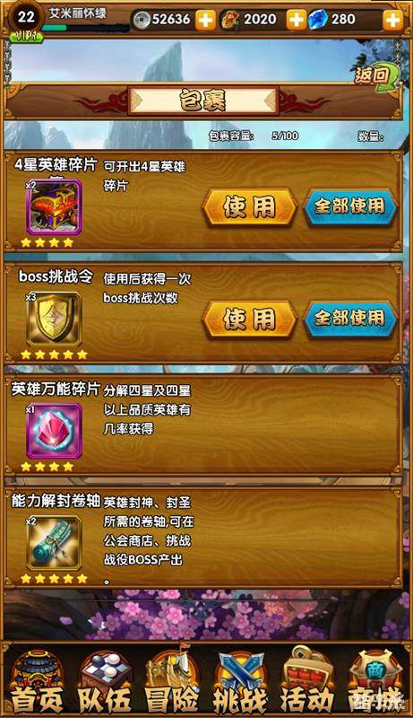背包作为游戏中必备的一个功能,可以存放消耗类物品以及活动材料,但是需要注意的一点是该游戏内的背包数量是固定的,无法扩展的,所以在挂机冒险之前请空余一定的背包数量,以便获得游戏物资。