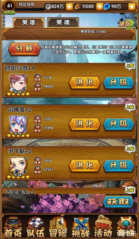 而进入游戏首页之后,点击“图鉴”,可以看到三个阵营中不同的英雄,在拥有足够材料和金币的情况下可以进行英雄的升级、进阶、升阶,也可以用英雄碎片合成高品级英雄,增加游戏中的战力。
