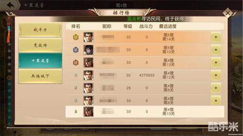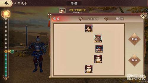 第一次进入“十里连营”,玩家可以从第一层开始层层挑战。点击每层的守关武将,都可以查看对方的阵容,根据对方的阵容合理搭配自己的阵容进行挑战。再次进入“十里连营”的时候,玩家可以选择已经通关过的层数继续进行挑战。