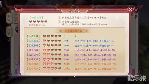 刷亲密度的目的当然是为了属性加成(没错,就是这么功利!难不成为了友谊吗?),刷的越高,加成越高,反正刷起来就对了!亲密度的属性加成只有在双方组队时才有效果。不过,不需要你们在同一地图,只要组队了就行。