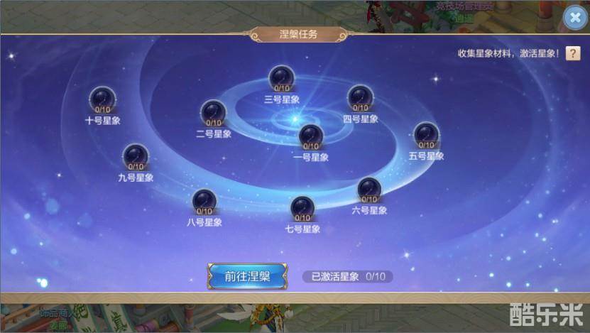涅槃任务第一阶段为“涅槃-星象激活”,需要玩家收集并激活10种星象;星象可通过日常玩法获取,也可以和小伙伴们交换,或在星象商店购买。涅槃任务第二阶段为“涅槃-五行炼狱”,玩家需要完成五行炼狱考验才可涅槃成功。五行炼狱共有5个BOSS,每个BOSS的特性有所区别,其中木BOSS拥有较高的物理伤害吸收特性,而火BOSS则是拥有禁用吸血属性特性。
