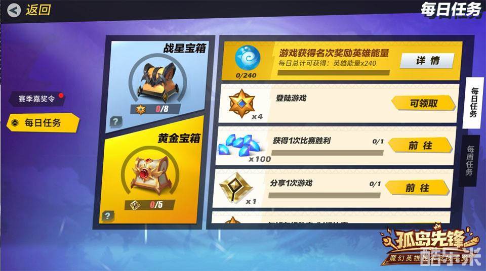 荣耀之路版本更新后,《孤岛先锋》每日任务将扩充为9个,玩家每日完成后可获得战星、钻石、金钥匙等奖励。同时任务系统奖励全面升级,不仅增加了战星宝箱等内容,奖励物品也更加丰厚。两种宝箱开启后均有概率获得英雄能量、金币、天赋技能书和钻石等道具。