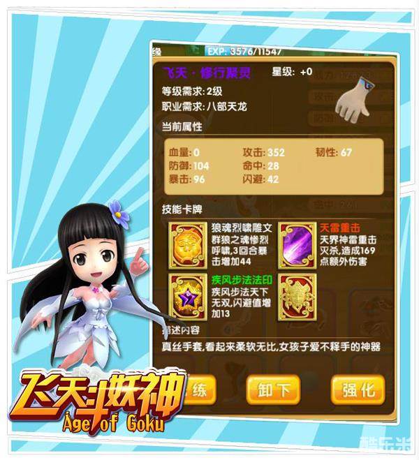 这个护手是10级别以前飞天系列中的装备,虽然有一张法力牌没有翻开,但是其他三个属性还是不错的,当然土豪可以使用洗练如玉把第四个也点开。