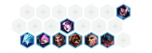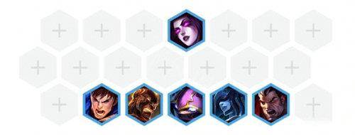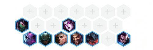 于是一套阵容在我脑海里面浮现了,它是这样子的:莫甘娜、剑魔、乌鸦、寡妇(火男)、德莱文、亚索,这套阵容的羁绊有4恶魔,3剑士以及双帝国一共6人口。在此基础上,我们的选择有很多: