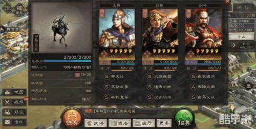 周瑜因为其自带战法,身为主将时发动概率提升至76%,这是一个巨大的提升,故而周瑜在这组合中,牢牢占据主将位置。同时因为其自带战法神火计需要靠发动主动战法才能几率触发,故而周瑜需要携带2个高发动几率主动战法来保证神火计的触发。这里选择了风助火势--帮助陆逊触发灼烧状态及杯蛇鬼车--提供恢复,这两个战法的触发几率都比较高,也大大提高了神火计的触发几率。