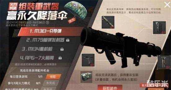 在该活动中,需要玩家通过任务的方式来搜集到一共4种重型武器的配件,并且通过组装之后来解锁下一个武器。而当4种武器全部解锁完毕,就可以获得我们这次的永久和平使命降落伞哦。