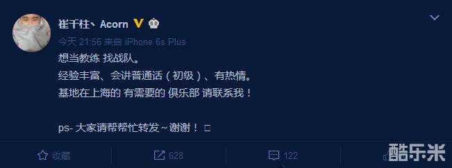 前三星蓝、LGD上单Acorn今日发布微博,表示想当教练,正在找俱乐部。