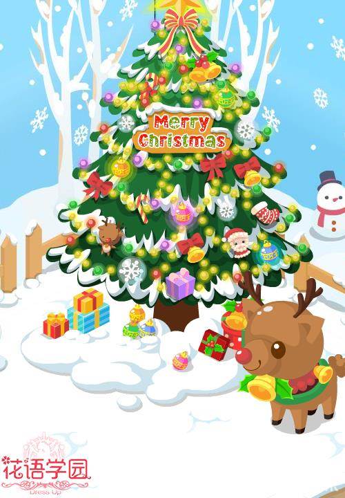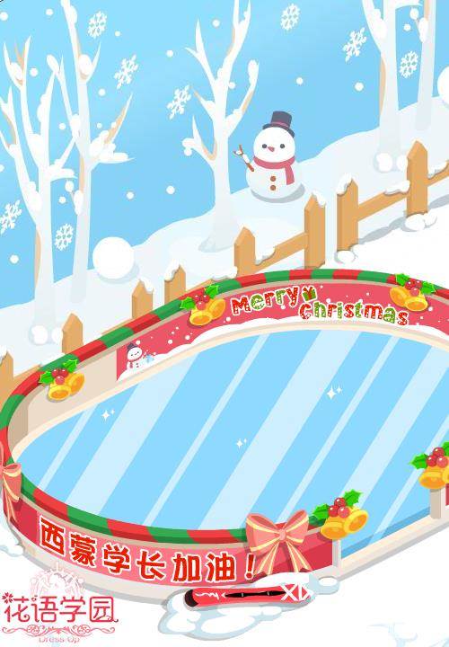 圣诞主题的室外装扮,是用一个栅栏围起来的小院子,院子的一角有一颗装扮一新的圣诞树,树下还有一只萌萌的驼鹿,似乎是驮着礼物提前来送来了祝福。还有写着“西蒙学长加油”并装饰着彩带的溜冰场,不知道和新版本的活动剧情是否有关呢?