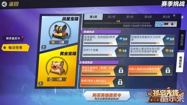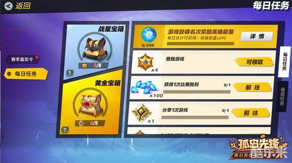 荣耀之路版本更新后,《孤岛先锋》每日任务将扩充为9个,玩家每日完成后可获得战星、钻石、金钥匙等奖励。同时任务系统奖励全面升级,不仅增加了战星宝箱等内容,奖励物品也更加丰厚。两种宝箱开启后均有概率获得英雄能量、金币、天赋技能书和钻石等道具。
