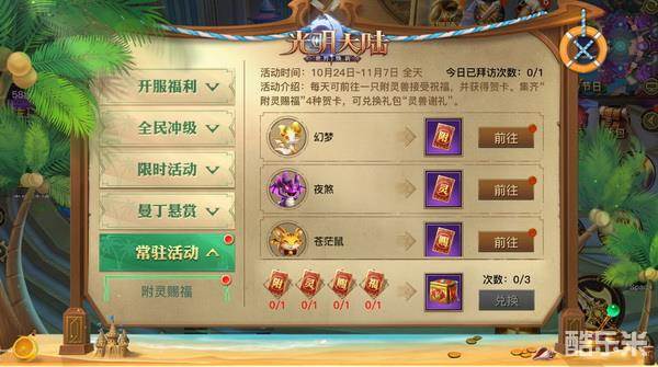 此外,附灵赐福活动上架。勇士们每天可前往接受附灵兽祝福,并获得贺卡。集齐“附灵赐福”4种贺卡,可兑换礼包灵兽谢礼。