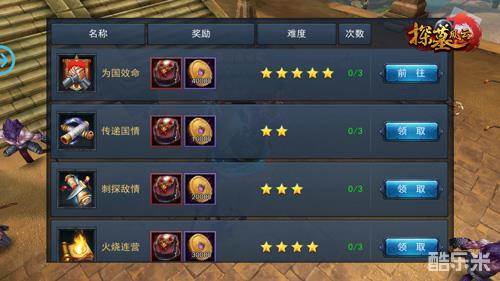 在《探墓风云》手游主界面的“活动”→“日常试炼”选项中,拉到下方便可以看到“国家任务”选项了,目前国家任务共有4项具体任务,每项任务每日可进行3次,值得一提的是,这几项任务的完成难度十分简单,而奖励却非常丰厚。