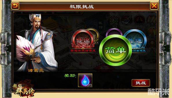 极限挑战有5个关卡,系统会随机刷出5个五星将领守关,玩家只能选择自己所拥有的五星将关卡进行攻打。换言之,就是极限挑战刷出了关羽和吕布守关,而你只有吕布,那么你只能用吕布去攻打吕布关卡,不能攻打关羽关卡。而每一个关卡又分5个难度,通关的难度越高,你的武将就越强。因此,如果你想考验你的武将有多强大,那就来极限挑战,启动同款武将PK模式吧!