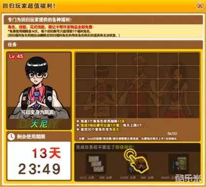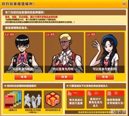 玩家可以在回归界面中领取LV45的福利角色,大尼、亚西、克里斯中的一个。福利角色使用期限为14天,每个账号只可以领取一次福利角色。(福利角色使用期限到期后,将自动删除,其角色身上的所有物品也会随之一起删除,无法恢复)