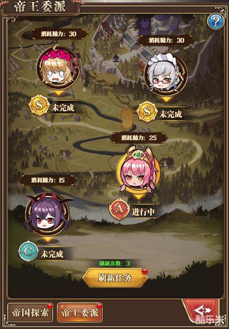 当我们切换至冒险,点击进入右下角奇遇按钮即可进入帝王委派功能当中。委派界面当中会显示品质不一的任务,品质越高的任务,完成后即可获得更多品质更高的强化材料。如果玩家对任务品质不满意,可以点击下方刷新任务按钮对出现任务进行刷新。五次免费刷新的机会用完后,我们可通过消耗钻石进行刷新。