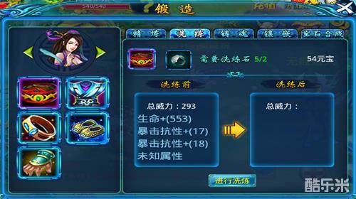 之后,只要在第一页的精炼面板中点击“进行精炼”按钮,就可以对装备进行属性强化了!