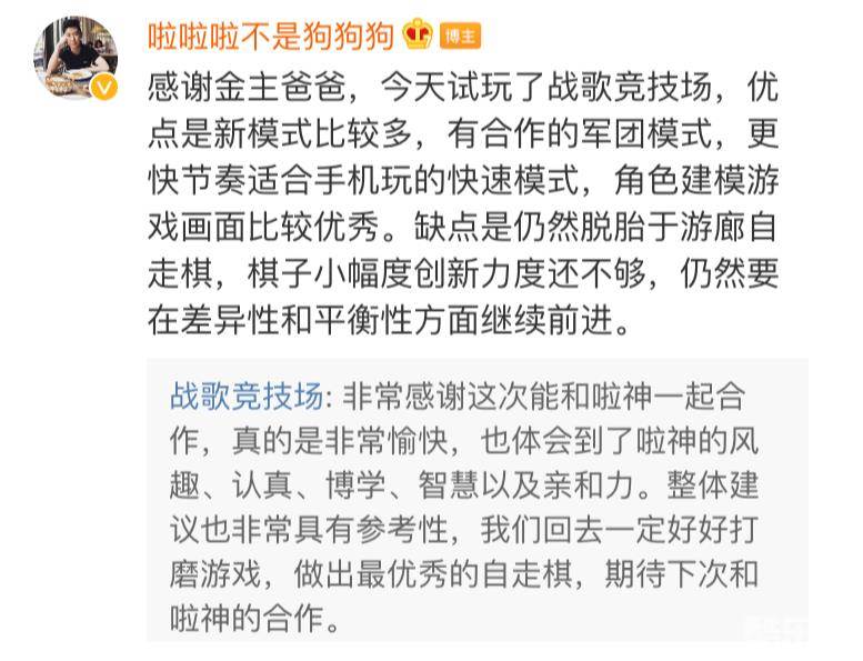 而在直播结束后,主播啦啦啦不是狗狗狗也在微博中对《战歌竞技场》再次进行点赞,并提出了建议,官博回复互动,并表示持续优化,希望能给到玩家最优质的自走棋品质。