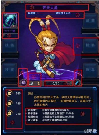 ⑤ —卡牌颜色(有三种颜色:绿色、蓝色、紫色)