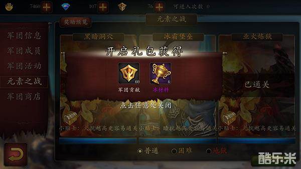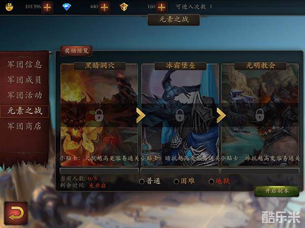 元素之战是军团专属战斗副本,你和你的军团成员们将在这里共同战斗,这里也是收获大量军团贡献和元素材料的好地方。