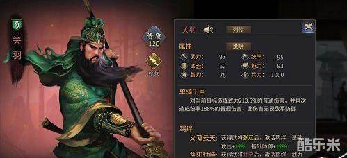 再来看技能“单骑千里”,对当前目标造成武力值210.05%的普通伤害,并再次造成统率188%无视目标防御力的伤害。关羽有这个这个技能在手,再加上本身高武力、高统率,伤害输出能力爆表,如果能搭配一些控制型的武将,效果会更好。