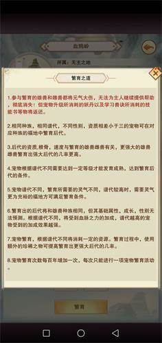 4. 宠物繁衍: 蛋里开出来的宠物是初代宠物,繁衍必须是同代,两个都是25级以上,且必须是一雄一雌,同种族,资质星级相差低于三星(估计相差三星不行)。繁衍需要宠物合和丹,紫府开到第三级,培养兽群可以获得培育心得在门派里面换,或者在玉皇天用10上灵或者100功德购买。繁衍地点在洞天福地,每个星级有三个地点,可以用来繁衍,越高星级的地点,培育下一代提高资质的几率越高。想繁衍必须先打过守门的怪物,培育妖兽的打妖王,培育鬼兽的打鬼王,魔兽打魔王,注意每天只能挑战一次。