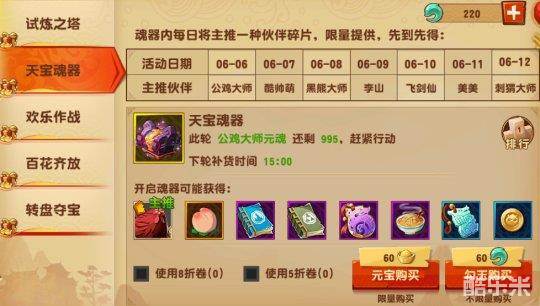自古以来,书中自有黄金屋、颜如玉,但是大侠们又知不知道,天宝魂器里自有神伙伴呢?现实中的朋友会经常帮助我们渡过难关,游戏里的神伙伴更是能够帮助我们提高一大截战力!因此天宝魂器从天而降,携同神伙伴,助大侠们一臂之力。活动期间,魂器内每日将主推一种伙伴碎片,大侠可以使用元宝和勾玉参与购买,元宝魂器限量供应,先到先得!打开魂器可得当日主推伙伴碎片,最多一次即可开出十个碎片!此时不出手更待何时?赶紧召唤神?铁牛和酷帅萌一起上学吧。