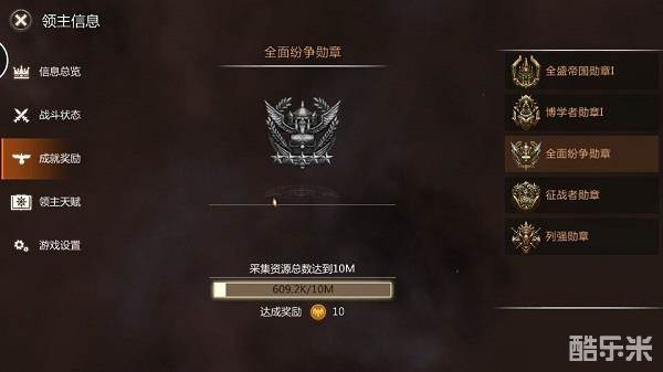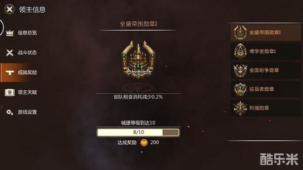 资源采集、研究科技、城池攻占不光能提升王国实力,还能激活相应的成就,获得对应的成就勋章和属性加成。