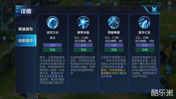 王昭君身为一个法师,每一个技能都有着很强的输出能力,并且都有减速或者冰冻的控制效果,这使得王昭君无论在对线或者团战中都能够发挥很好的作用。但是王昭君的技能施法有一定的延迟,所以想要技能命中目标需要一定的预判,技能命中率的高低决定了王昭君的输出和控制能力的强弱。