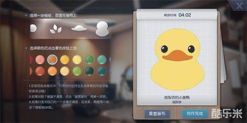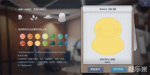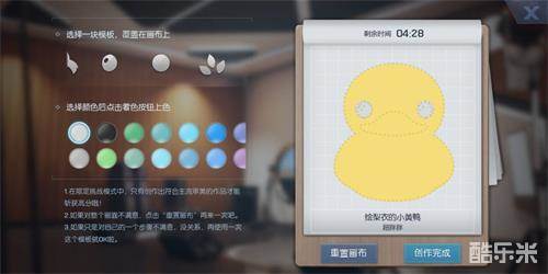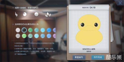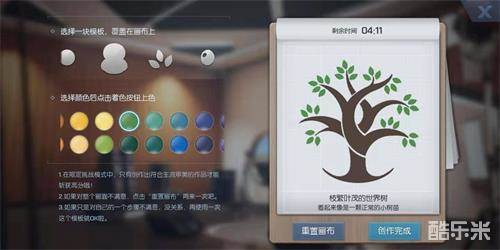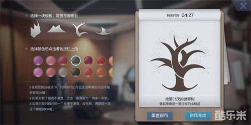 首先我们来了解一下喷绘,一级喷绘有两种图案,分别是枝繁叶茂的世界树和绘梨衣的小黄鸭,界面左上角有不同小图案,左边有颜色盘,把小图案拖拽到右面白板上和虚线重合的位置,再选颜色可以构成一幅喷绘啦,真的究极简单,看一眼大概就能会了叭